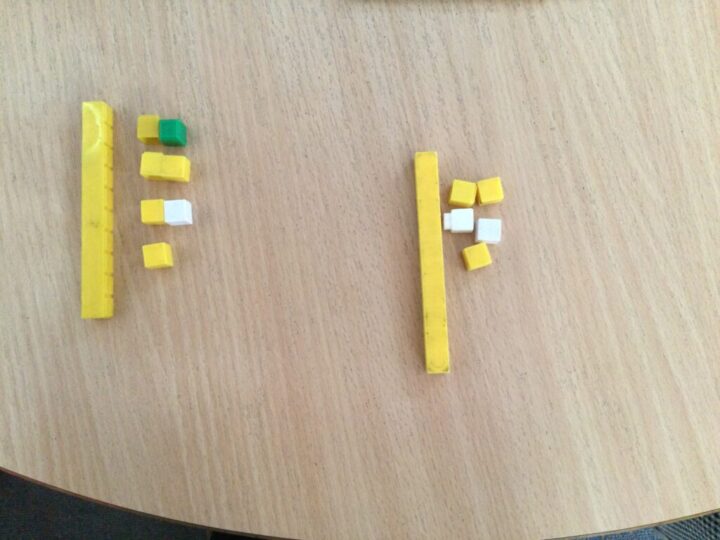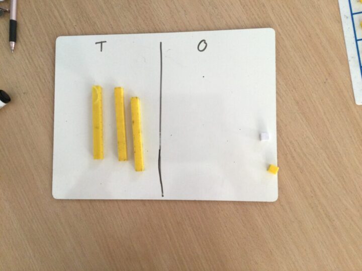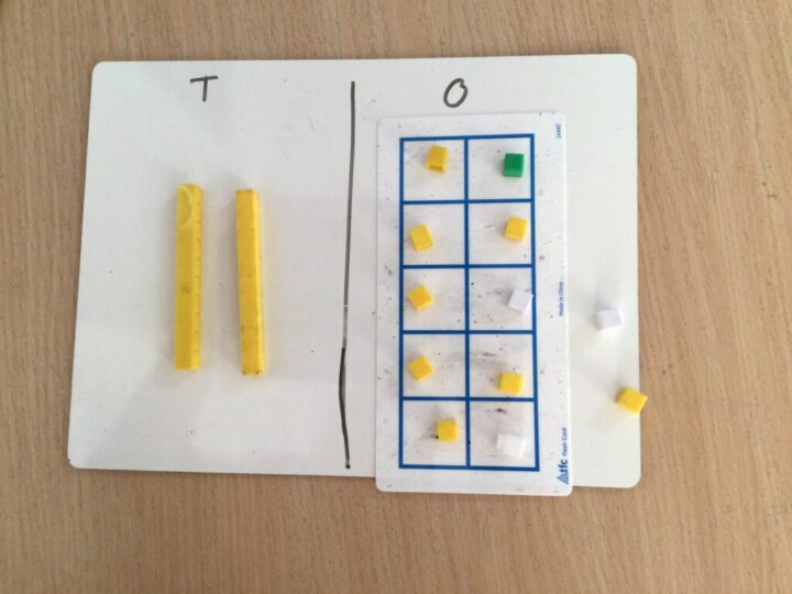 In Maths we have been working on adding 2 digit numbers when you need to exchange 10 ones for one 10. See the steps below for the sum 17+15=32